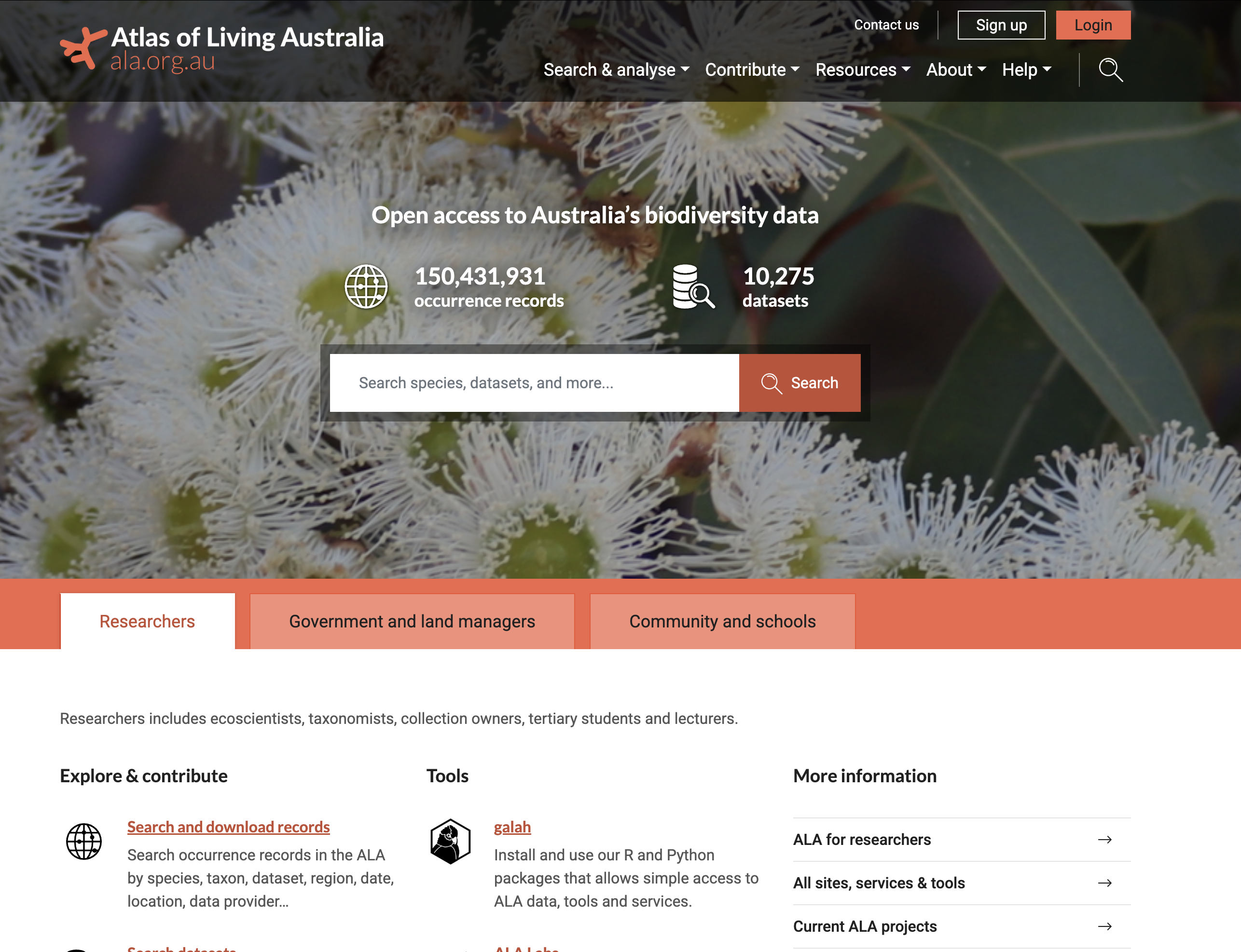What is in it: The Atlas of Living Australia (ALA) is a collaborative, digital, open infrastructure that pulls together Australian biodiversity data from multiple sources, making it accessible and reusable.
