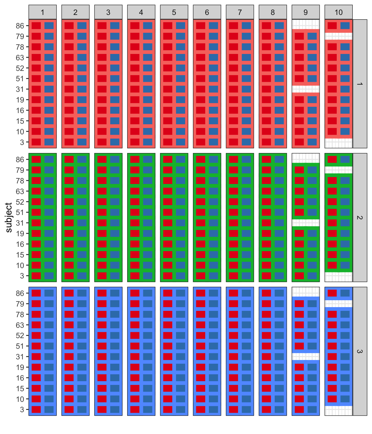 10 week sensory experiment, 12 individuals assessed taste of french fries on several scales, fried in one of 3 different oils, replicated twice.